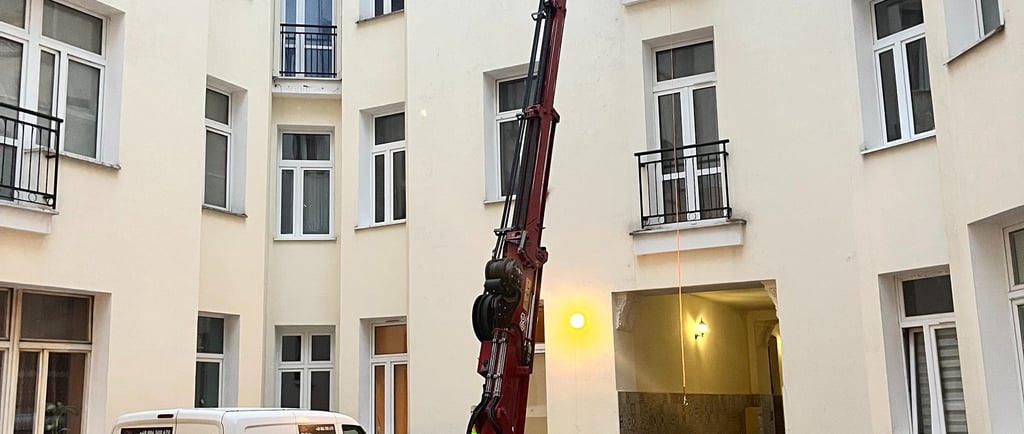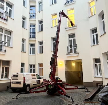 Mini żurawie sprawdzają się na gęstej zabudowie, w dziedzińcach, atriach i na wyższych kondygnacjach. Wjadą przez wąskie bramy i korytarze. Mogą pracować na delikatnych posadzkach, często także w trybie elektrycznym, bez spalin i hałasu. Ułatwiają montaż przez okna fasadowe, tarasy i świetliki dachowe.